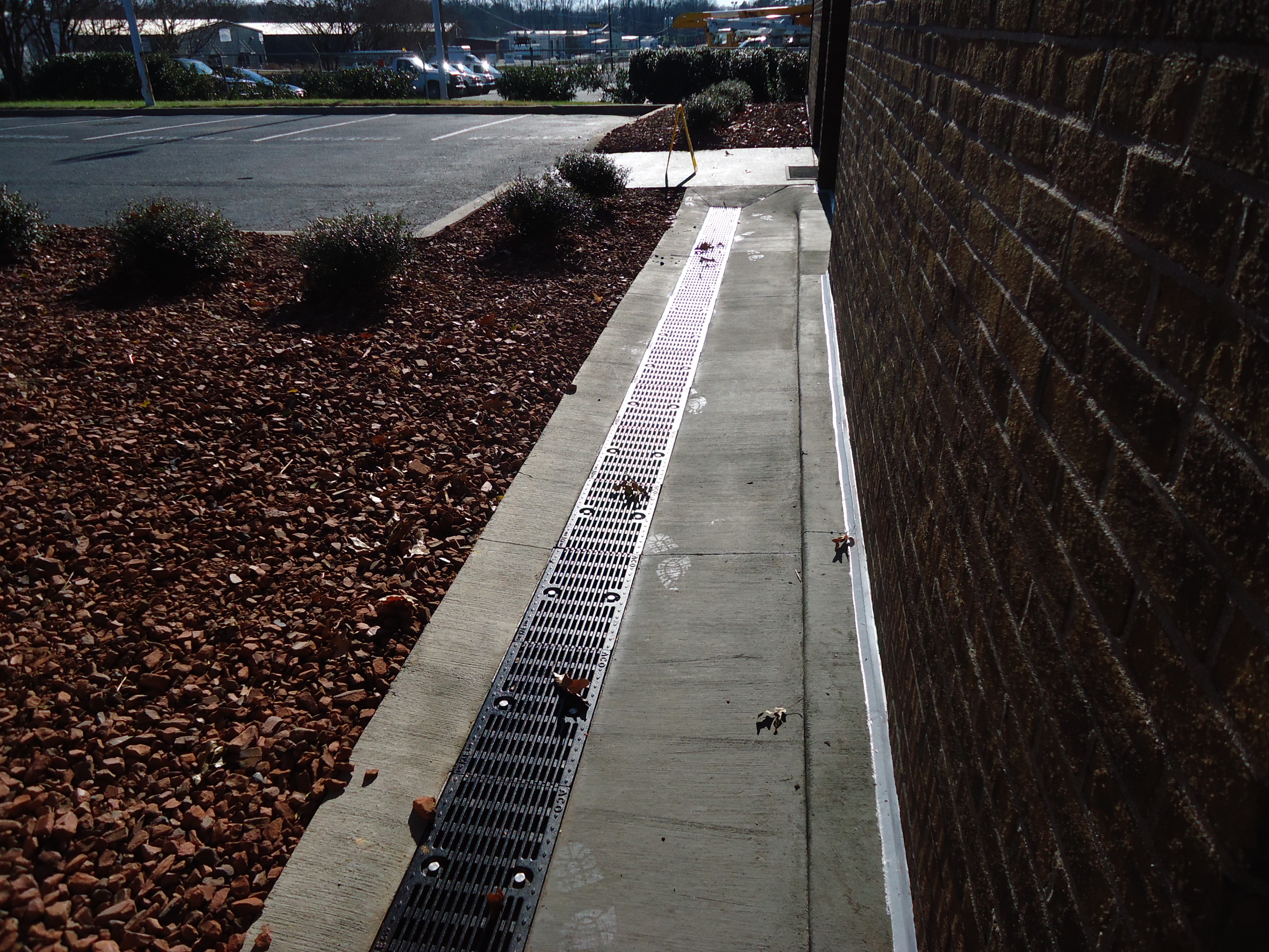 The scope of work that our team designed and installed included replacement of the through-wall flashing system in the exterior masonry walls, the installation of a trench drain system at the base of the building, the installation of additional catch basins and modifying the grade towards our new drainage features and away from the building.